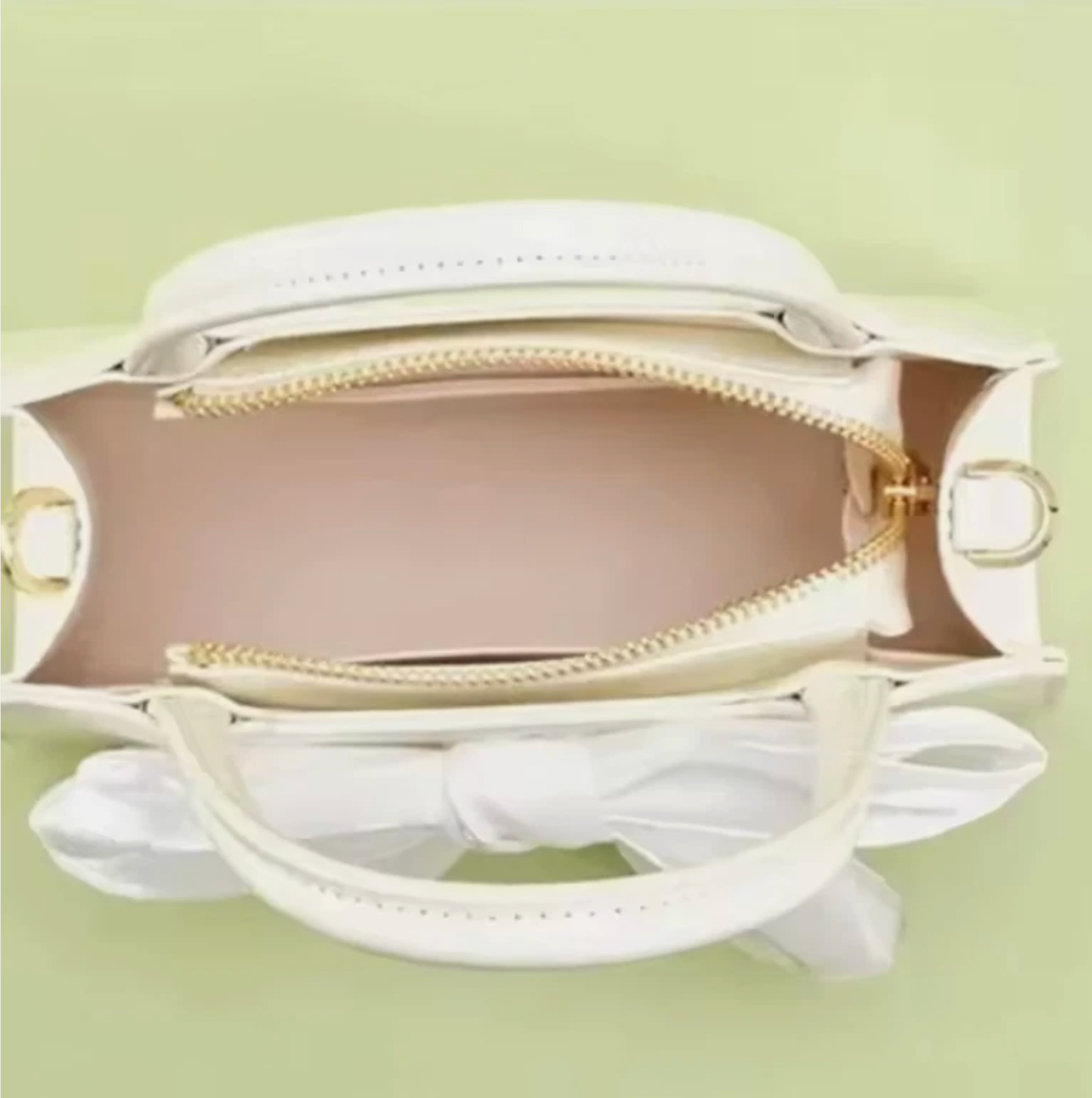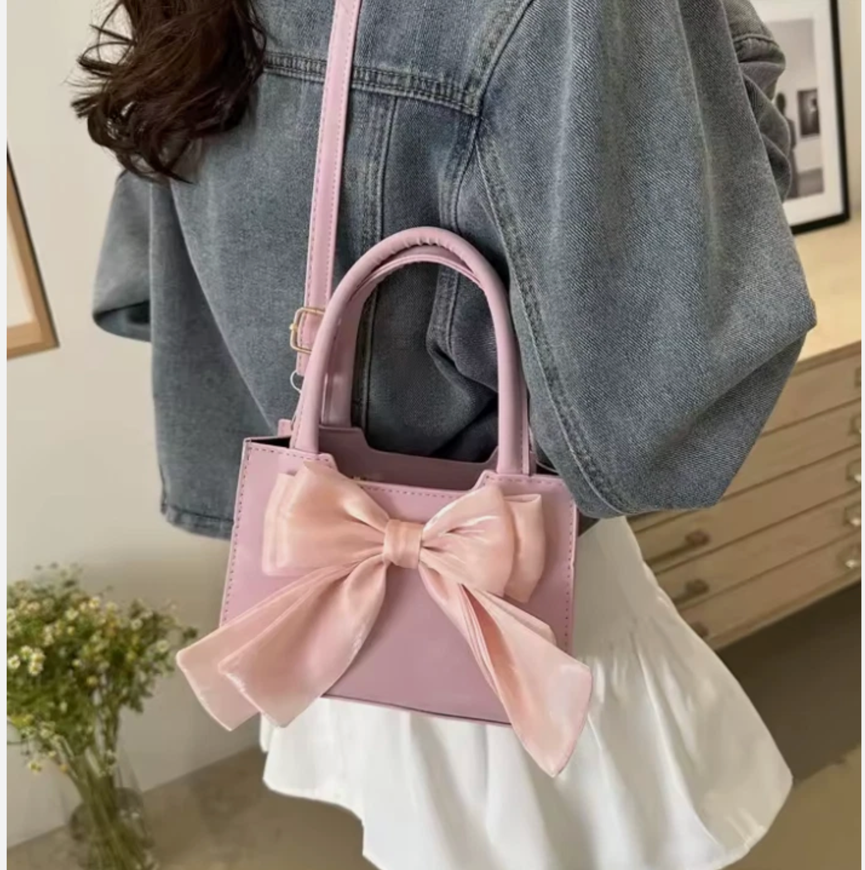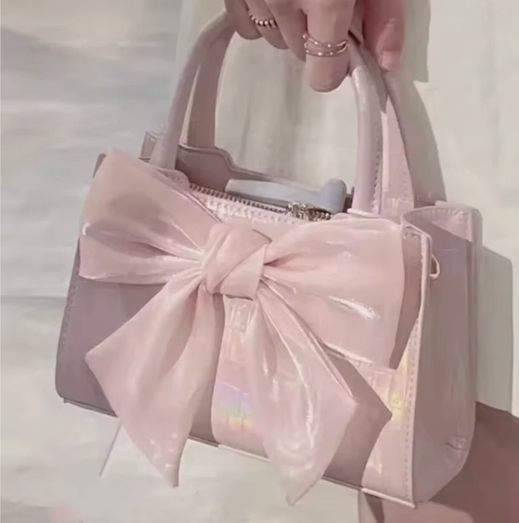 Woman's Firm Silky Pink Bow Tie Ribbon Shiny Hand Bag Small